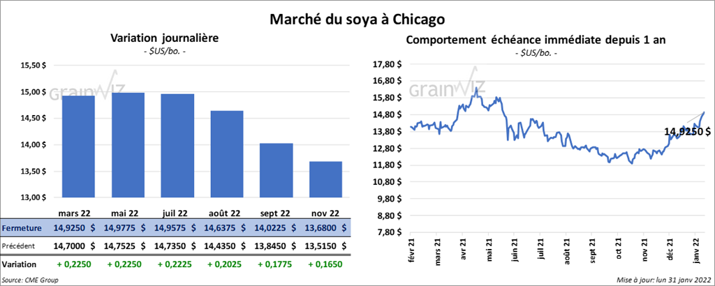 Les contrats de soya US aux échéances les plus rapprochées ont clôturé en hausse entre 22 ¼ et 22 ½ cents. Ceux de tourteau de soya US aux échéances les plus rapprochées ont également fermé dans le vert entre 7,00 et 7,70 $/tonne. Les contrats d’huile de soya US aux échéances les plus rapprochées ont terminé en baisse entre 43 et 45 points.