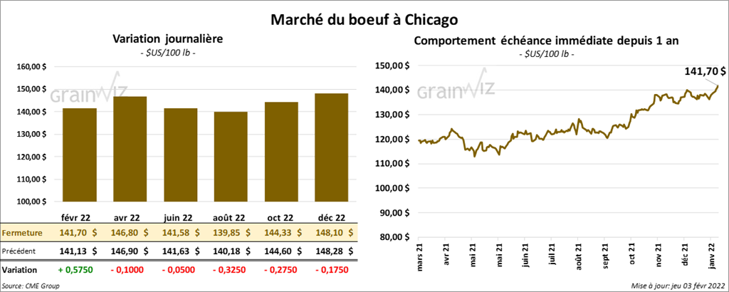Les contrats de bœuf US aux échéances les plus rapprochées ont terminé la journée en baisse entre 5 et 10 cents. Celui février 22 a fait exception en fermant en hausse de 57 cents. Ceux de veau US aux échéances les plus rapprochées ont clôturé avec des pertes entre 12 et 15 cents.
