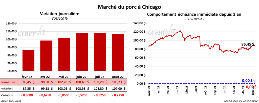 - Le 1er février dernier, le CME Lean Hog Index était en hausse de 15 cents à 83,29 $.