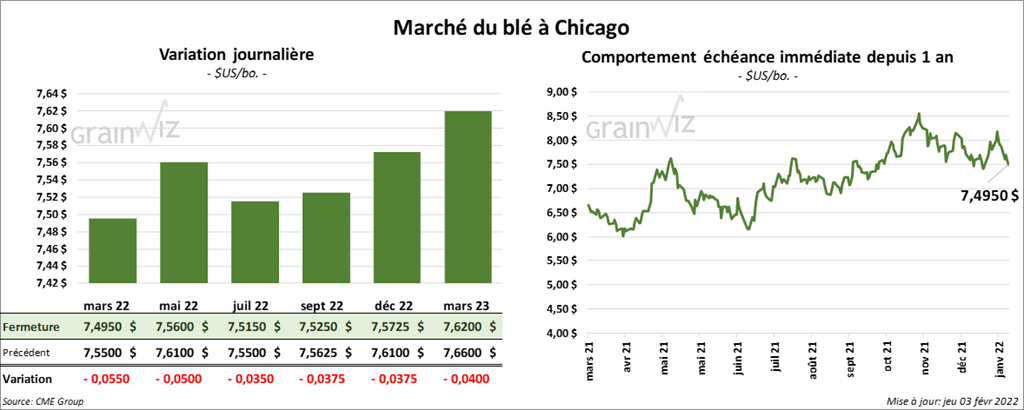 - Durant la semaine du 27 janvier dernier, les ventes à l’exportation de blé US 2021/22 ont été de 57,500 tonnes, ce qui était une réduction de 92 % comparativement à la semaine précédente et une baisse de 83 % par rapport à la moyenne des 4 dernières semaines. La Colombie et le Nigeria ont été les principaux acheteurs. Pour 2022/23, les ventes à l’exportation ont été de 103,500 tonnes. Les Philippines et le Mexique ont été les plus gros acheteurs. Les attentes des analystes étaient entre 200,000 et 880,000 tonnes.