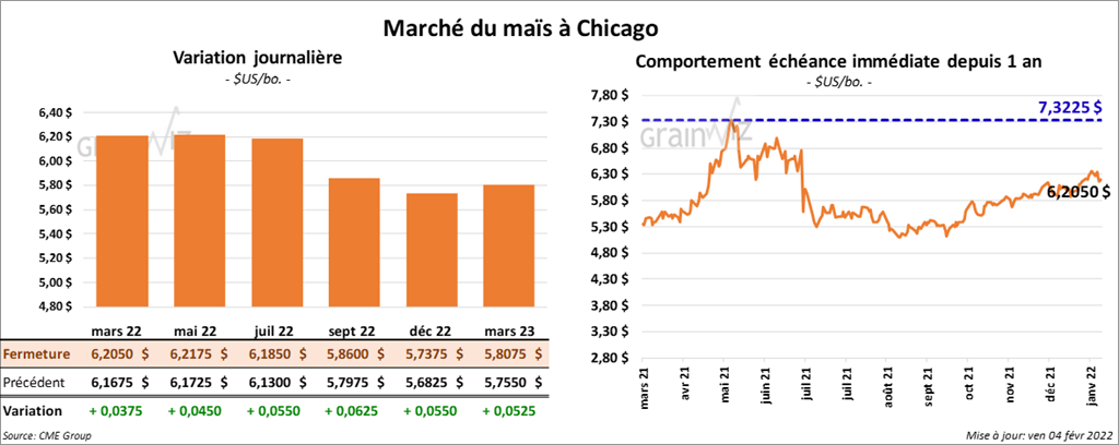 Les contrats de maïs US aux échéances les plus rapprochées ont terminé la journée en hausse entre 3 ¾ et 5 ½ cents.