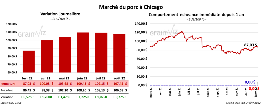 - Le 2 février dernier, le CME Lean Hog Index était en progression de 4 cents à 83,33 $.
