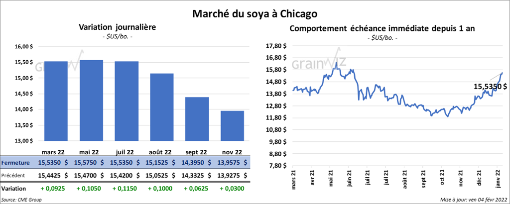 Les contrats de soya US aux échéances les plus rapprochées ont clôturé avec des gains entre 9 ¼ et 11 ½ cents. Ceux de tourteau de soya US aux échéances les plus rapprochées ont également fermé en progression entre 6,60 et 6,80 $/tonne. Les contrats d’huile de soya US aux échéances les plus rapprochées ont fini la session en baisse entre 34 et 39 points.