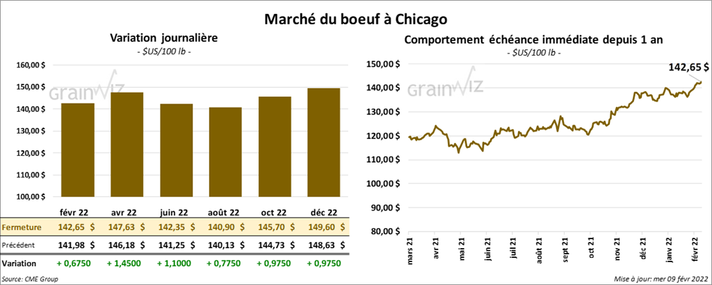 - Le 8 février dernier, le CME Feeder Cattle Index était en progression de 61 cents à 162,04 $.
