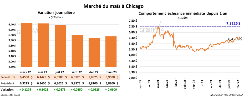 - Le rapport d’offre de demande de février a été publié ce midi. L’USDA estime que les stocks de fin d’année de maïs US n’ont pas bougé par rapport à janvier dernier. Il les évalue à 1,540 milliard de boisseaux alors que les attentes des analystes étaient moins élevées à 1,512 milliard de boisseaux. L’an passé, les inventaires avaient été établis à 1,235 milliard de boisseaux.