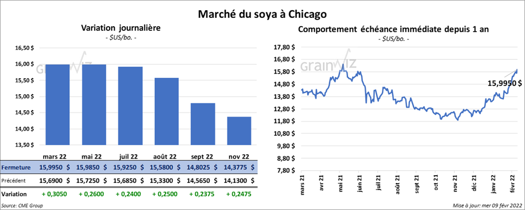 Les contrats de soya US aux échéances les plus rapprochées ont terminé la journée en hausse entre 24 et 30 ½ cents. Ceux de tourteau de soya US aux échéances les plus rapprochées ont également fini en progression entre 7,70 et 8,70 $/tonne. Les contrats d’huile de soya US aux échéances les plus rapprochées ont fermé dans le vert entre 69 et 75 points.