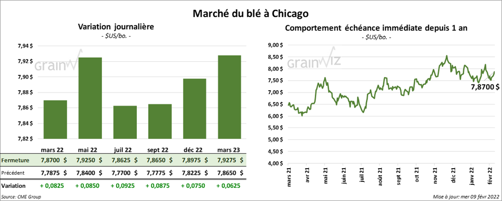 À Chicago, les contrats de blé aux échéances les plus rapprochées ont clôturé avec des gains entre 8 ¼ et 9 ¼ cents. À Kansas, les contrats de blé dur rouge aux échéances les plus rapprochées ont terminé la séance en progression entre 12 ½ et 15 ¼ cents. À Minneapolis, ceux de blé de printemps aux échéances les plus rapprochées ont fini en hausse entre 13 ½ et 14 ½ cents.