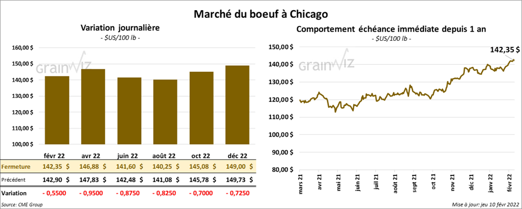 - Le 9 février dernier, le CME Feeder Cattle Index a été en progression de 69 cents à 162,73 $.