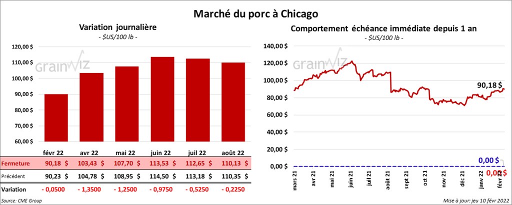 - Le 8 février dernier, le CME Lean Hog Index était en hausse de 60 cents à 87,22 $.