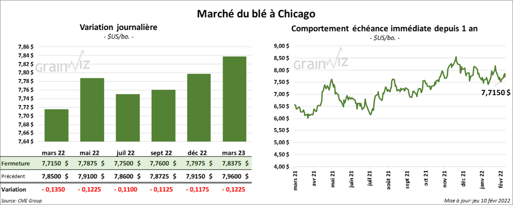 - Durant la semaine du 3 février dernier, les ventes à l’exportation de blé US 2021/22 ont été de 84,800 tonnes, ce qui était une augmentation de 48 % par rapport à la semaine précédente et une baisse de 75 % comparativement à la moyenne des 4 dernières semaines. Les Philippines et le Mexique ont été les principaux acheteurs. Les anticipations des analystes étaient entre 100,000 et 400,000 tonnes. Pour 2022/23, les ventes à l’exportation ont été de 48,400 tonnes. Le Japon et le Guatemala ont été les plus gros acheteurs. Les attentes des analystes étaient entre 25,000 et 300,000 tonnes.