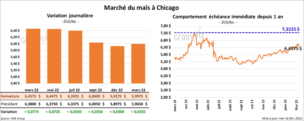 Les contrats de maïs US aux échéances les plus rapprochées ont terminé la séance en en hausse entre 5 ½ et 7 ¾ cents.