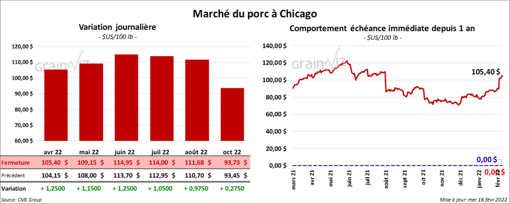 - Le 14 février dernier, le CME Lean Hog Index était en progression de 1,33 $ à 91,84 $.