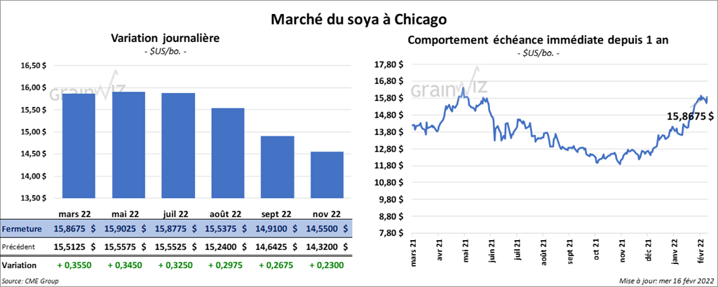 Les contrats de soya US aux échéances les plus rapprochées ont clôturé avec des gains entre 32 ½ et 35 cents. Ceux de tourteau de soya US aux échéances les plus rapprochées ont également fini dans le vert entre 9,80 et 10,60 $/tonne. Les contrats d’huile de soya US aux échéances les plus rapprochées ont fermé en progression entre 132 et 134 points.