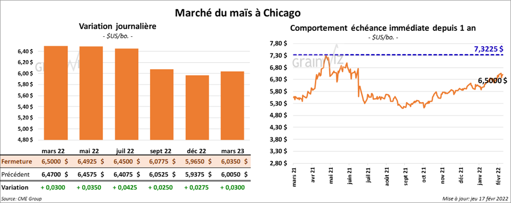 - Durant la semaine du 10 février dernier, les ventes à l’exportation de maïs US 2021/22 ont été de 820,000 tonnes, ce qui était une augmentation de 39 % par rapport à la semaine précédente et une baisse de 23 % comparativement à la moyenne des 4 dernières semaines. Le Japon et le Mexique ont été les principaux acheteurs. Pour 2022/23, les ventes à l’exportation ont été de 113,500 tonnes. Le Mexique et le Japon ont été les plus gros acheteurs.