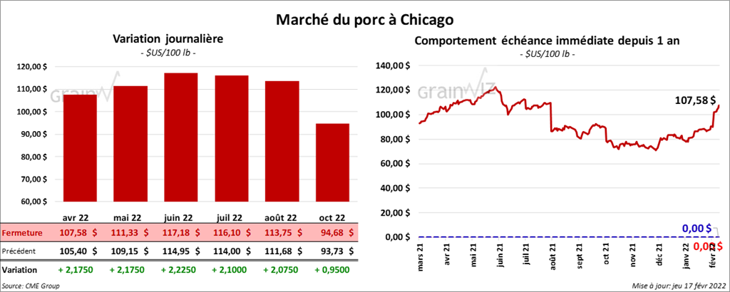- Le 15 février dernier, le CME Lean Hog Index était en hausse de 1,50 $ à 93,34 $.