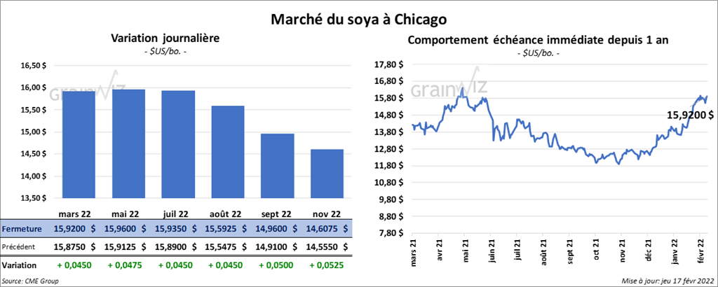 Les contrats de soya US aux échéances les plus rapprochées ont clôturé en progression entre 4 ½ et 4 ¾ cents. À l’exception du contrat mars 22, qui a fermé en baisse de 20 cents/tonne. Les contrats de tourteau de soya US aux échéances les plus rapprochées ont fini en progression entre 20 et 70 cents/tonne. Les contrats d’huile de soya US aux échéances les plus rapprochées ont terminé la session en baisse de 16 points.