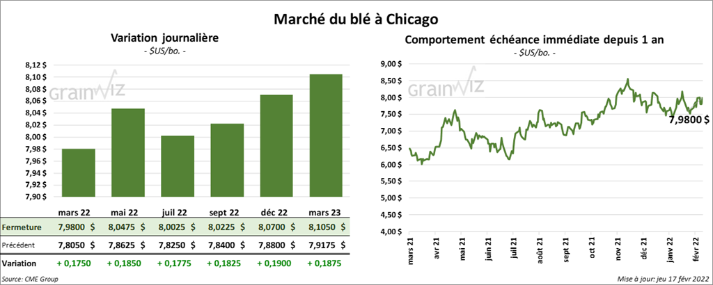 À Chicago, les contrats de blé aux échéances les plus rapprochées ont clôturé en hausse entre 17 ½ et 18 ½ cents. À Kansas, les contrats de blé dur rouge aux échéances les plus rapprochées ont terminé la journée en progression entre 15 et 15 ¾ cents. À Minneapolis, ceux de blé de printemps aux échéances les plus rapprochées ont également fermé avec des gains entre 5 ¼ et 8 ¼ cents.
