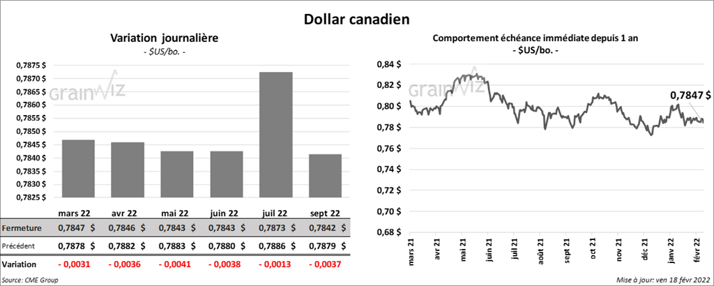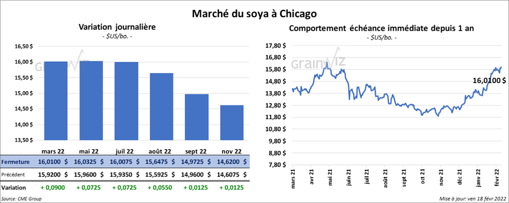 Les contrats de soya US aux échéances les plus rapprochées ont terminé la séance en progression entre 7 ¼ et 9 cents. Ceux de tourteau de soya US aux échéances les plus rapprochées ont fait l’inverse en finissant en baisse entre 1,80 et 2,40 $/tonne. Les contrats d’huile de soya US aux échéances les plus rapprochées ont fermé dans le vert entre 73 et 76 points.