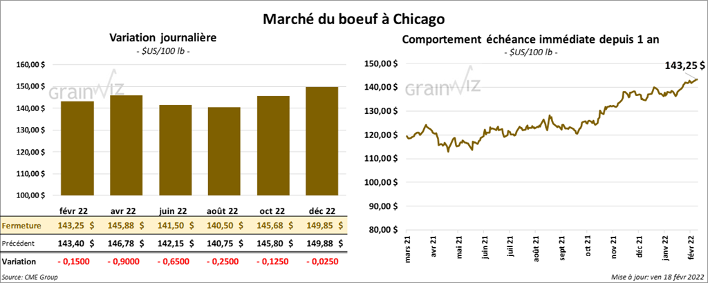 - Le 17 février dernier, le CME Feeder Cattle Index était au neutre à 162,14 $.