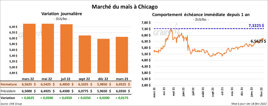 - CFTC : Le 15 février dernier, les spéculateurs avaient réduit leurs positions dans le maïs US de 3,5 % à 325,514 contrats. Le minimum des 52 dernières semaines était de 208,799 contrats et le maximum de 401,993 contrats.