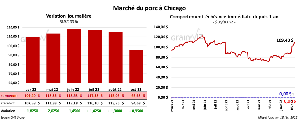 - Le 16 février dernier, le CME Lean Hog Index était en progression de 90 cents à 94,24 $.
