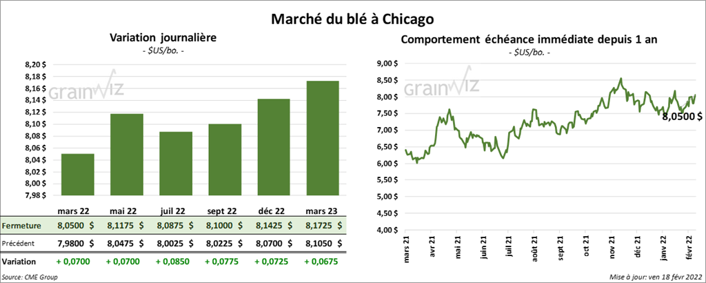 À Chicago, les contrats de blé aux échéances les plus rapprochées ont clôturé avec des gains entre 7 et 8 ½ cents. À Kansas, ceux de blé dur rouge aux échéances les plus rapprochées ont également fini en progression entre 11 ¾ et 12 ¼ cents. À Minneapolis, les contrats de blé de printemps aux échéances les plus rapprochées ont terminé la journée entre le neutre et une hausse de 4 ½ cents.