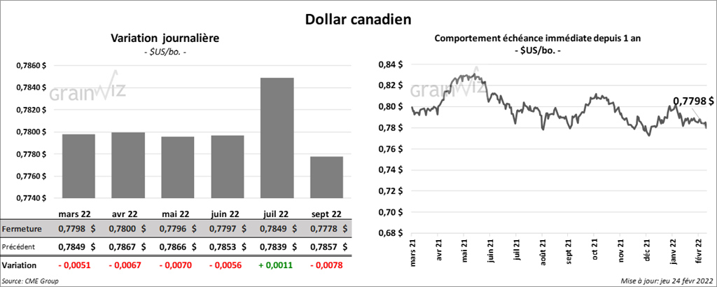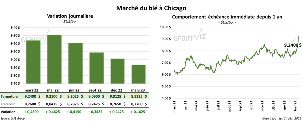 - La Russie a envahi l’Ukraine hier soir, ce qui fournit un support aux prix du grain à la hausse. La situation suscite aussi des inquiétudes pour l’économie mondiale.