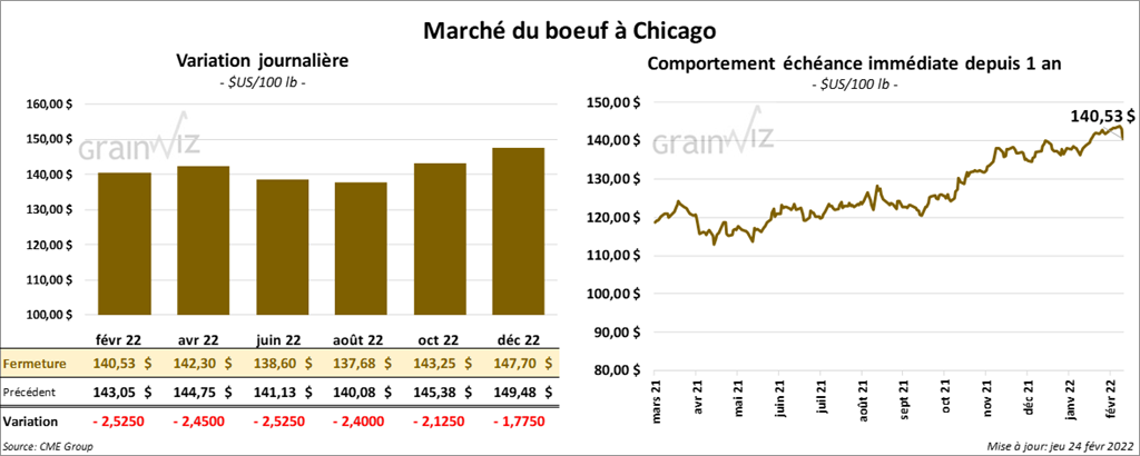 - Le 23 février dernier, le CME Feeder Cattle Index était en baisse de 44 cents à 161,82 $.
