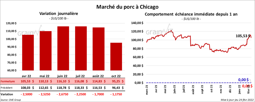 - Le 22 février dernier, le CME Lean Hog Index était au neutre à 98,16 $.