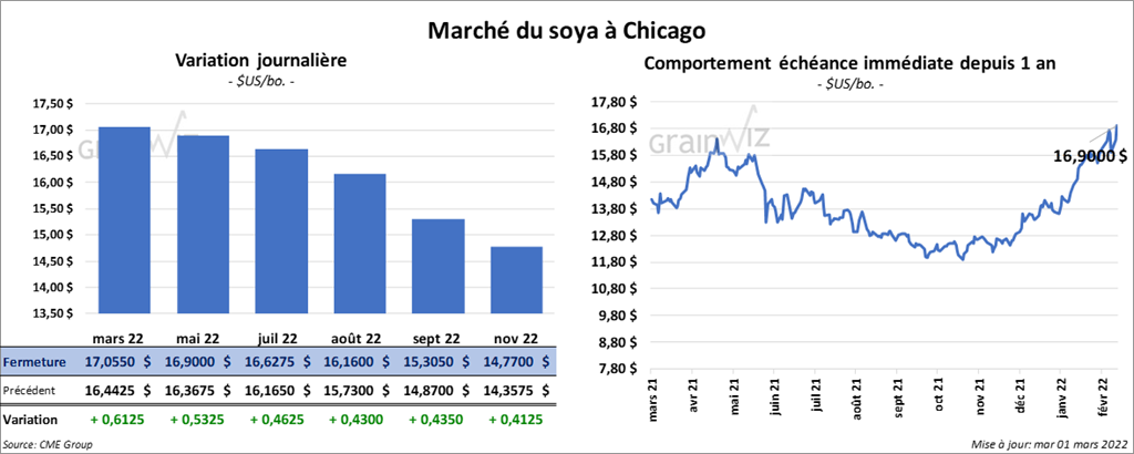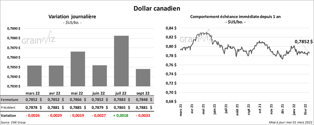 - Le rapport Fats & Oils de mars a été présenté aujourd’hui. L’USDA estime que 194 millions de boisseaux de soya US ont été triturés au cours du mois de janvier dernier, ce qui était une baisse comparativement aux 198 millions de boisseaux de décembre 2021. C’était aussi une réduction par rapport aux 197 millions de boisseaux de soya US triturés en janvier 2021. 2,28 milliards de lbs d’huile de soya US ont ainsi été produites au cours de janvier 2022, soit une baisse de 2 % comparativement à décembre dernier. De plus, l’USDA mentionne que pour janvier dernier, les stocks d’huile de soya US ont été de 2,11 milliards de lbs, ce qui était une hausse de 3,8 % par rapport au mois de décembre 2021.