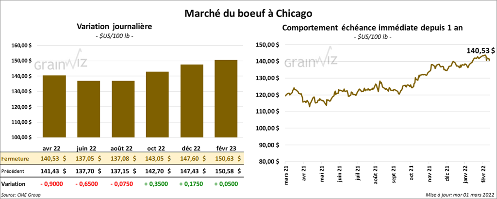 - Le 28 février dernier, le CME Feeder Cattle Index était en baisse de 24 cents à 159,67 $.