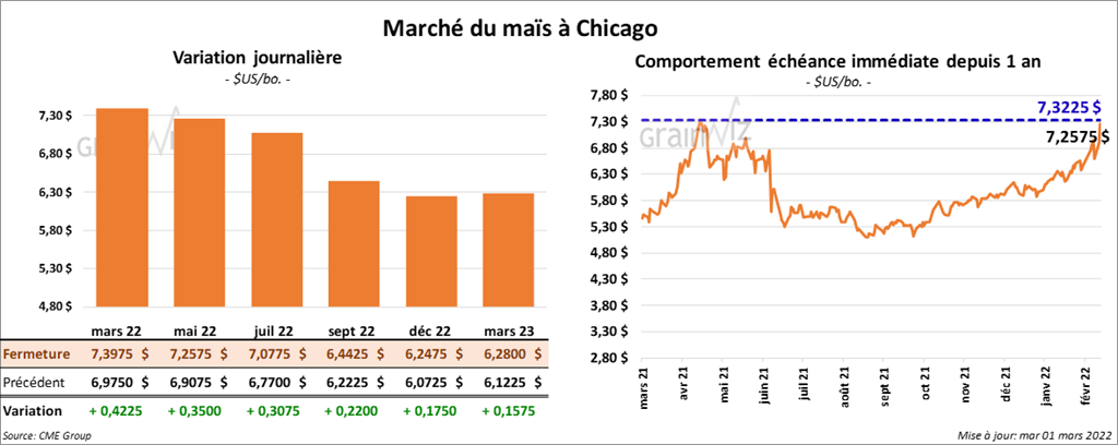 Les contrats de maïs US aux échéances les plus rapprochées ont fini la journée en hausse entre 30 ¾ et 42 ½ cents.