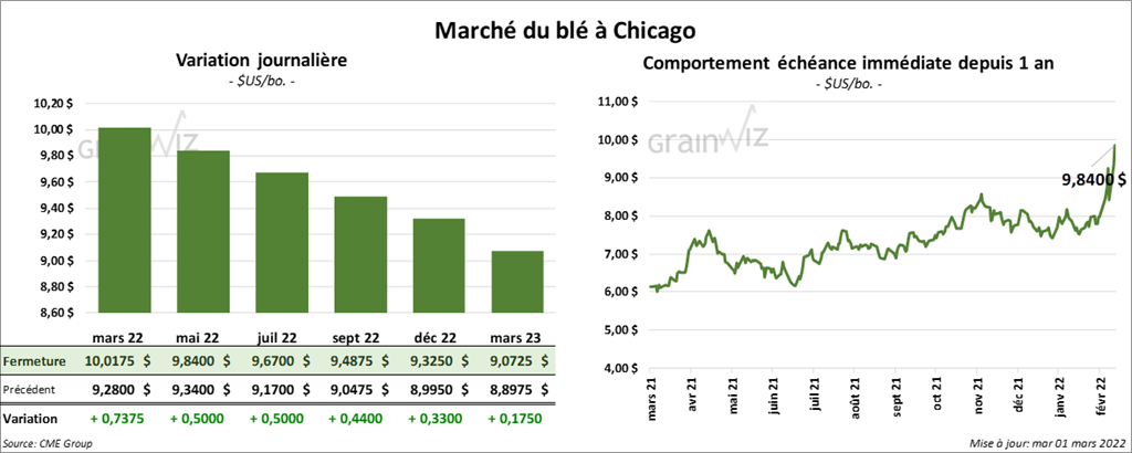 À Chicago, les contrats de blé aux échéances les plus rapprochées ont terminé la journée en progression entre 50 et 73 ¾ cents. À Kansas, ceux de blé dur rouge aux échéances les plus rapprochées ont également clôturé en hausse entre 50 et 57 ¾ cents. À Minneapolis, les contrats de blé de printemps aux échéances les plus rapprochées ont fermé avec des gains entre 58 ¾ et 65 cents.