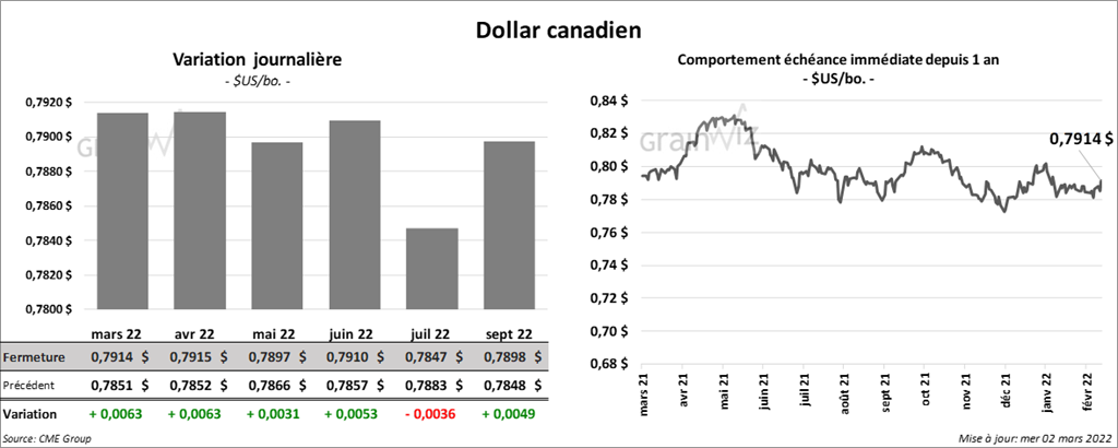 - Le conflit entre la Russie et l’Ukraine force les acheteurs mondiaux de blé à trouver une alternative au marché de la région de la mer Noire. Les analystes croient que l’Australie et l’Inde devraient avoir des productions record de blé au cours de l‘année, ce qui pourrait freiner un peu la pression à la hausse des prix du blé. La Russie et l’Ukraine représentent 29 % des exportations mondiales de blé.