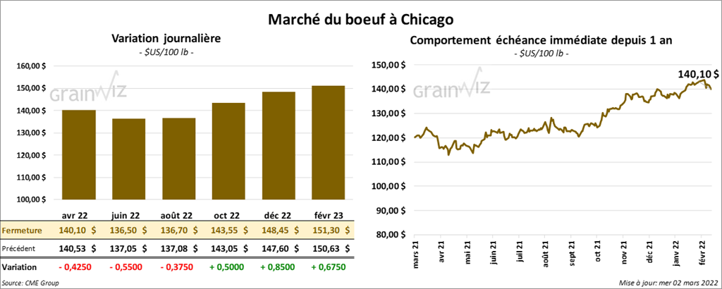 - Le 1er mars dernier, le CME Feeder Cattle Index était en baisse de 42 cents à 159,25 $.