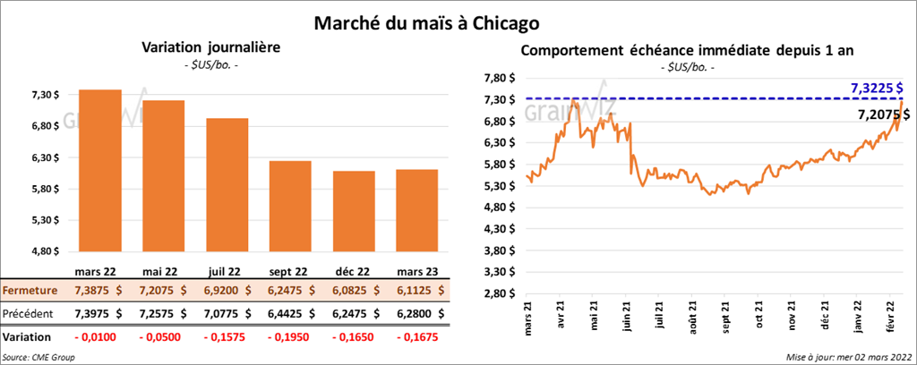 - La possibilité d’une prolongation du conflit entre la Russie et l’Ukraine inquiète les marchés mondiaux. Dans le cas du maïs, la région de la mer Noire en représente 20 % des exportations mondiales. De plus, les analystes craignent les pertes de production du maïs ukrainien.