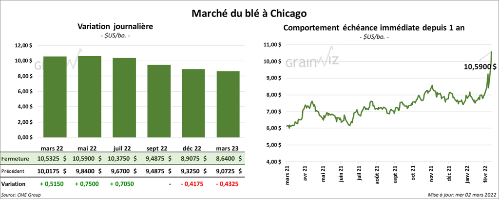 À Chicago, les contrats de blé aux échéances les plus rapprochées ont clôturé avec des gains entre 51 ½ et 75 cents. À Kansas, les contrats de blé dur rouge aux échéances les plus rapprochées ont fermé en hausse entre 47 ½ et 75 cents. À Minneapolis, les contrats de blé de printemps aux échéances les plus rapprochées ont fini en progression entre ¾ et 7 ¾ cents. Celui juillet 22 a fait exception en terminant au neutre.