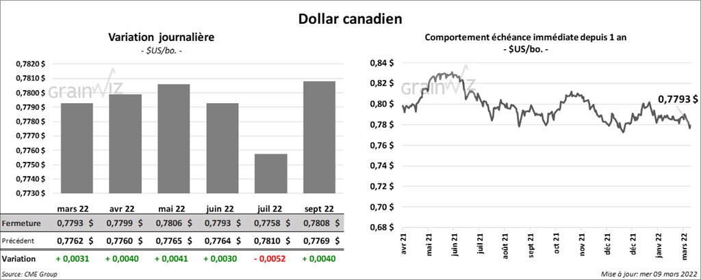 - Mondialement, l’USDA évalue les stocks de fin d’année de soya à 89,96 millions de tonnes, ce qui représente une baisse par rapport aux 92,83 millions de tonnes de février dernier. Les projections des analystes étaient inférieures à 89,46 millions de tonnes dans un jeu entre 85,5 et 93,4 millions de tonnes. Du côté du Brésil, l’USDA a ajusté à la baisse son estimation de la production de soya de 134 millions de tonnes en février dernier à 127 millions de tonnes ce mois-ci. Les analystes s’attendaient à une réduction moins forte à 129,01 millions de tonnes. Dans le cas de l’Argentine, l’USDA a réduit son estimation de la production de soya de 45 millions de tonnes en février à 43,5 millions de tonnes ce mois-ci. Les anticipations des analystes étaient légèrement plus faibles à 43,39 millions de tonnes.