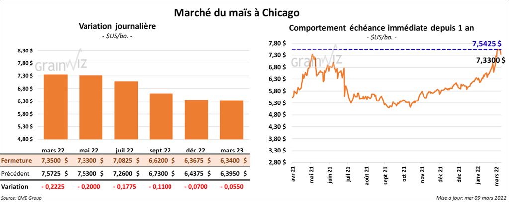 Les contrats de maïs US aux échéances les plus rapprochées ont terminé la journée en baisse entre 17 ¾ et 22 ¼ cents.