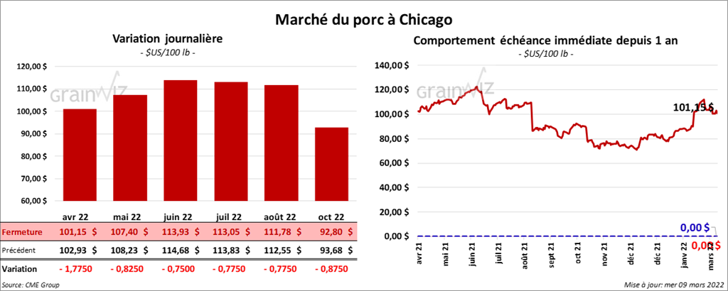 - Le 7 mars dernier, le CME Lean Hog Index était en recul de 28 cents à 99,00 $.