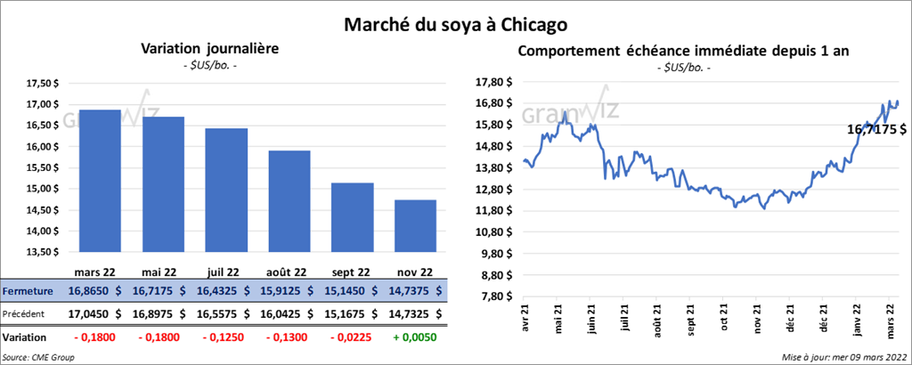Les contrats de soya US aux échéances les plus rapprochées ont clôturé en baisse entre 12 ½ et 18 cents. Ceux de tourteau de soya US aux échéances les plus rapprochées ont fait l’inverse en finissant en hausse entre 1,40 et 5,10 $/tonne. Les contrats d’huile de soya US aux échéances les plus rapprochées ont fermé quelque part entre une progression de 39 points et une baisse de 160 points.