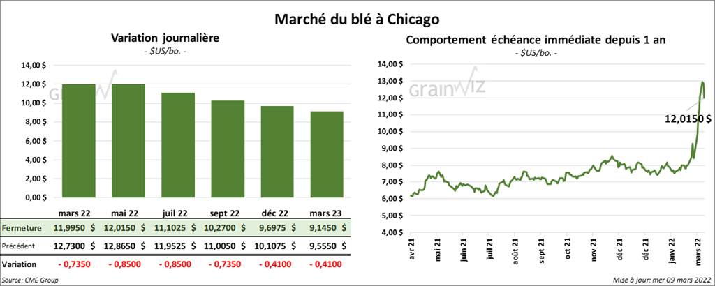 À Chicago, les contrats de blé aux échéances les plus rapprochées ont terminé la session en baisse entre 73 ½ et 85 cents. À Kansas, les contrats de blé dur rouge aux échéances les plus rapprochées ont clôturé en recul entre 79 ¾ et 85 cents. À Minneapolis, les contrats de blé de printemps aux échéances les plus rapprochées ont également clôturé avec des pertes entre 31 ¾ et 60 cents.