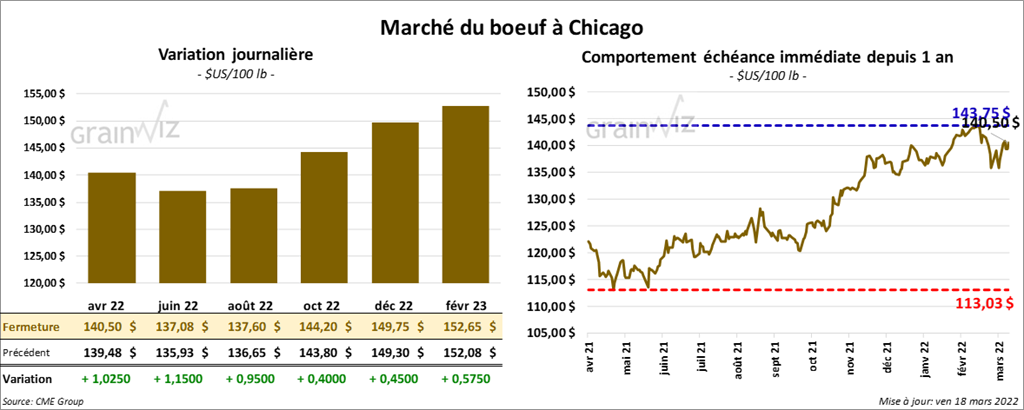- Le 17 mars dernier, le CME Feeder Cattle Index était en hausse de 62 cents à 154,85 $.