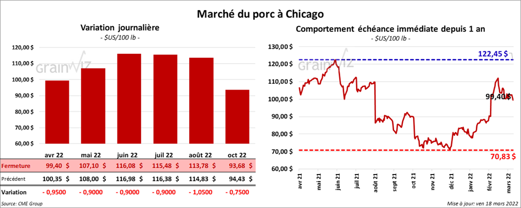 - Le 16 mars dernier, le CME Lean Hog Index était en hausse de 36 cents à 100,77 $.