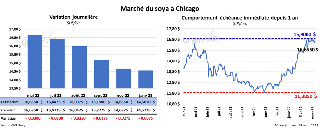 Les contrats de soya US aux échéances les plus rapprochées ont clôturé en recul entre 3 et 3 ½ cents. Ceux de tourteau de soya US aux échéances les plus rapprochées ont fait l’inverse en terminant la session en hausse entre 2,20 et 2,90 $/tonne. Ceux d’huile de soya US aux échéances les plus rapprochées ont fermé avec des pertes entre 121 et 234 points.