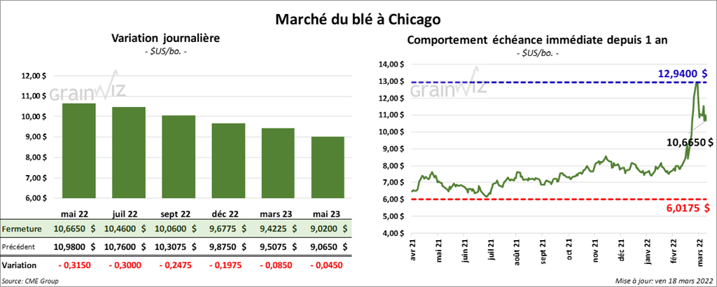 À Chicago, les contrats de blé aux échéances les plus rapprochées ont terminé la séance en baisse entre 24 ¾ et 31 ½ cents. À Kansas, ceux de blé dur rouge aux échéances les plus rapprochées ont également clôturé avec des pertes entre 13 et 21 ¾ cents. À Minneapolis, les contrats de blé de printemps aux échéances les plus rapprochées ont fini en recul entre 13 ¼ et 19 ¾ cents.