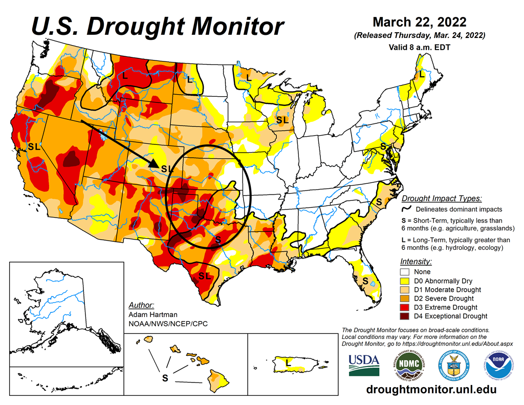 - Selon le Drought Monitor établi pour le 22 mars dernier, les conditions sèches dans les zones de production de blé d’hiver US ont chuté à 70 %. L’USDA estimait tout de même que les conditions sèches dans les secteurs de production de blé d’hiver US étaient à 21 % «modérées», à 31 % «sévères», à 16 % «extrêmes» et à 2 % «exceptionnelles».