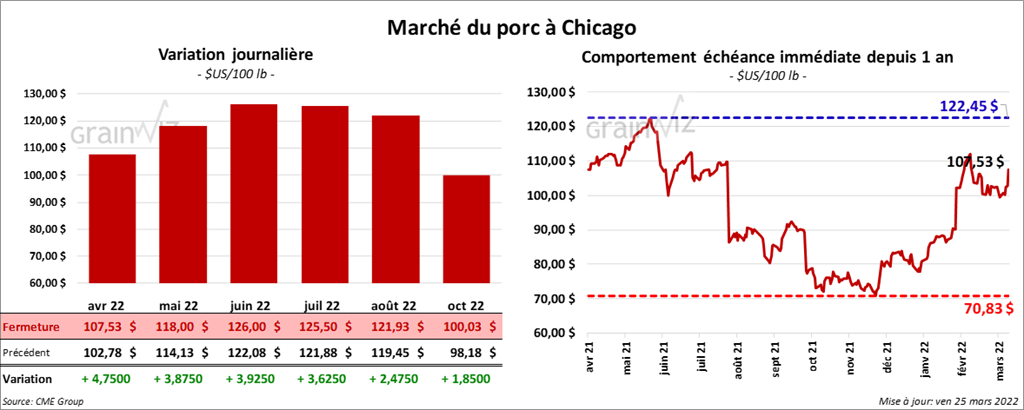 - Le 23 mars dernier, le CME Lean Hog Index était en hausse de 29 cents à 101,50 $.