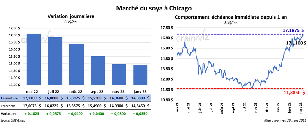 Les contrats de soya US aux échéances les plus rapprochées ont terminé la journée en hausse entre 4 et 10 ¼ cents. Ceux de tourteau de soya US aux échéances les plus rapprochées ont également fini dans le vert entre 2,30 et 3,00 $/tonne. Les contrats d’huile de soya US aux échéances les plus rapprochées ont clôturé en progression entre 46 et 50 points.