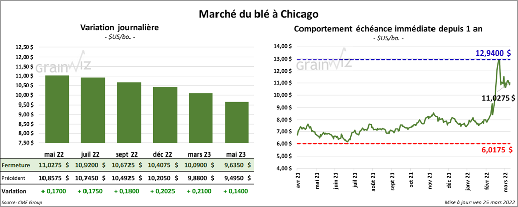 À Chicago, les contrats de blé US aux échéances les plus rapprochées ont fini la séance en hausse entre 17 et 18 cents. À Kansas, ceux de blé dur rouge aux échéances les plus rapprochées ont également clôturé avec des gains entre 15 ¾ et 20 cents. À Minneapolis, les contrats de blé de printemps ont terminé en progression entre 20 ½ et 22 cents.